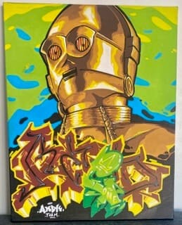 Toile représentant C-3PO en doré, sur fond dégradé vert/bleu/noir, avec lettrage KZED doré et touche verte.